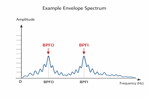 (Figure 2. The prominence of characteristic bearing fault frequencies (BPFO and BPFI) in the envelope spectrum is an indicator of localized damage.)