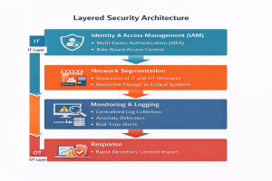 Identity and Access Management (IAM) controls the initial point of contact. Network segmentation limits the spread of attacks. Logging and security monitoring enable early detection. In environments where these layers are not jointly implemented, a security breach can result in operational disruption and physical damage risk [1][5].