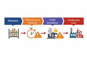 No spare part → Work order postponed → Maintenance delayed → Failure escalates → Production loss occurs
