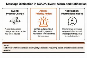 Not everything seen on a SCADA screen is an “alarm”. A practical distinction:
