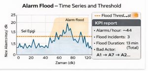 – Flood definition: >10 new alarms in 10 minutes → “alarm flood mode” [7]