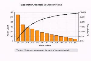 – Daily/weekly alarm report: alarms/hour, top 20 noisiest alarms, flood events, ack delays [6][7].