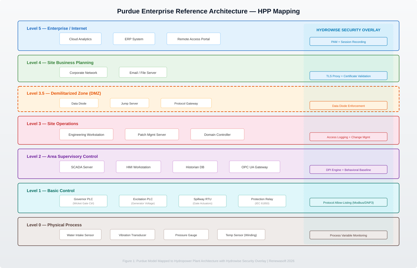 Level 0 (Physical): Water intake sensors, vibration transducers, penstock pressure gauges, generator winding temperature sensors.