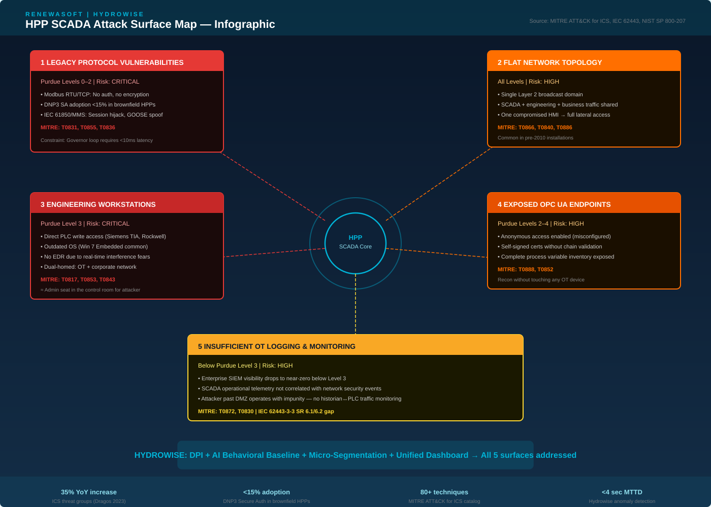 Infographic 1: HPP SCADA Attack Surface Map — Five Critical Exposure Categories [4][8]