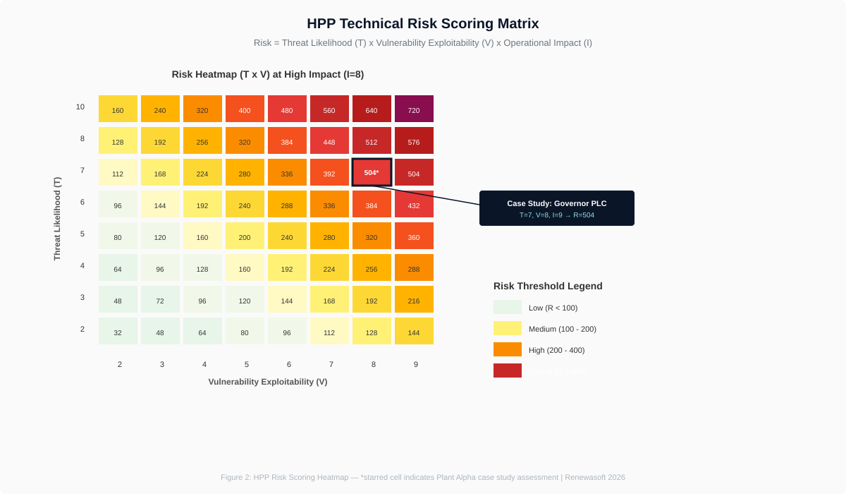 The Impact Score includes a cascade multiplier for hydrologically linked plants. A compromised asset at Plant A (I=7 in isolation) can escalate to I=9-10 when downstream flood consequences are factored in. Aligns with ICOLD Bulletin 178 on dam safety and cyber risk[11].