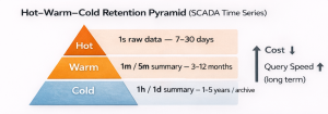 Keeping SCADA data as raw forever is expensive. TSDB approaches generally apply a hot–warm–cold pyramid:
