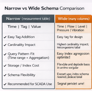 In practice, as the number of SCADA tags grows, a wide layout becomes difficult to manage. A narrow layout makes adding new tags easier and better matches time-series workloads. The trade-off is that it requires correct indexing and correct partition/chunk tuning. In the Timescale ecosystem, decisions such as “single hypertable vs multiple tables” matter for this reason [5].