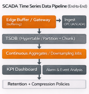 Figure 2 — SCADA measurement pipeline: Edge buffer → TSDB ingest → Continuous aggregates → Dashboard/Alarm screens.