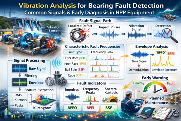 Bearing Failure Detection through Vibration Analysis: Common Signals and Early Diagnosis Approaches in Hydroelectric Power Plant Equipment Introduction In hydroelectric power plants, turbine and generator bearings are critical components exposed to high loads and prolonged operating periods. Local defects in these bearings generate impulsive vibrations at each contact event. These impulses propagate through the dynamic [...] Read More