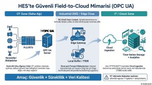 HES’te sahadan buluta veri akışı; güvenlik + süreklilik + veri kalitesi üçlüsünü aynı anda sağlamalıdır. OPC UA güvenlik modeli, IEC 62443 segmentasyonu ve edge gateway kesinti toleransı ile Hydrowise analitik değer zinciri sürdürülebilir hale gelir.