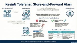 Kesintili bağlantılarda edge gateway’de store-and-forward kuyruk + yerel zaman serisi kayıt kritik hale gelir. Bağlantı gelince veriler idempotent şekilde batch replay edilir. Kesintili bağlantı tasarım gereksinimi olarak ele alınmalıdır. [6]