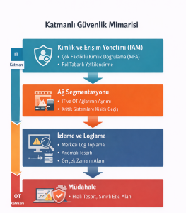 (Şekil 2. IT’den OT katmanına doğru uygulanan katmanlı güvenlik mimarisini ve temel savunma adımlarını göstermektedir.)